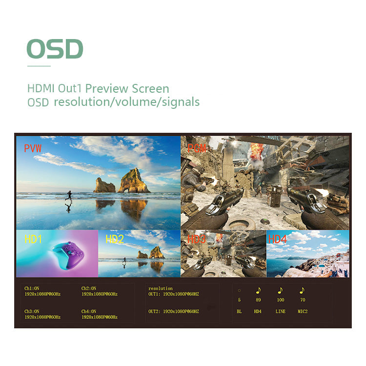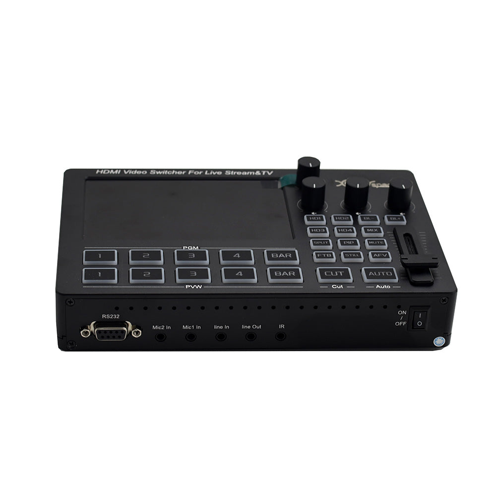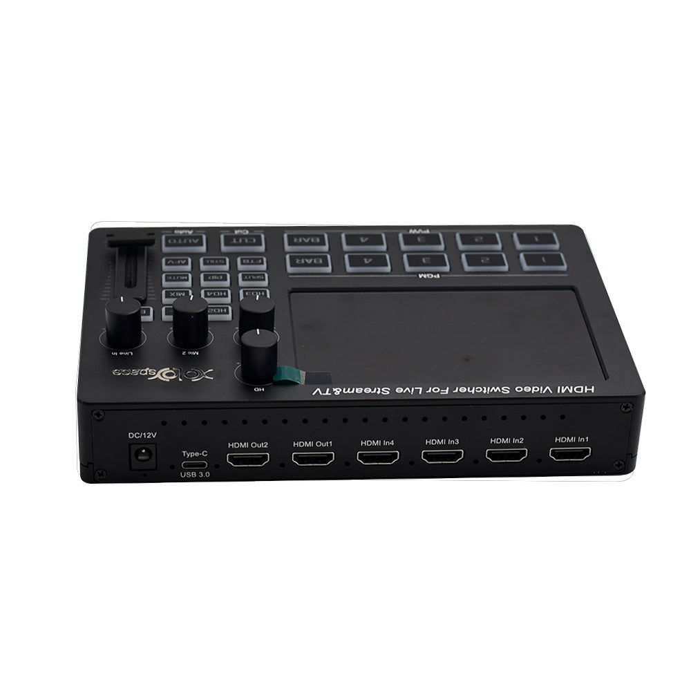 The 4way video switcher for live streaming, support 4 HDMI input resolution 1920X1080@60Hz, the output resolution is 1920X1080@60Hz and support HDCP1.4 standard. Support HD embedded audio or External analog audio, after mixed processing, can be embedded in the output HD signal or output from the analog port. Built-in 5-inch IPS HD screen real-time preview, Suitable for program production, interview and speech on-site production, outdoor events, school courseware production and other video switching needs. It can be used in live streaming and various event venue.
