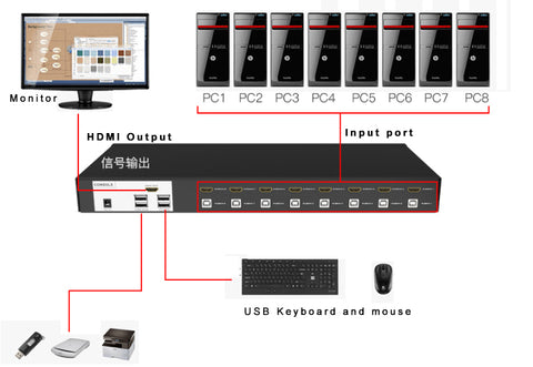 This HDMI KVM switch support a set of keyboard, mouse and monitor to control 8 computers. And also support USB dash connected. High definition support, 4k*2k@30Hz resolution provide. You can switch this KVM switch over hotkey and push button. Hot-key mean you can switch via the keyboard corresponding key.