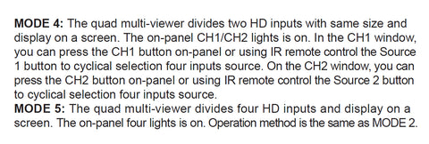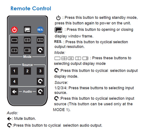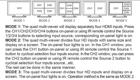 The high performance 4×1 quad multi-viewer supports four routes HDMI high definition input contents be displayed on one HDMI screen and one VGA screen simultaneously. It supports analog audio output that can be selected different input source. Supports five multi-view display modes. Output resolution can be adjusted and supports the maximum up to 4K30Hz. The product can be controlled via the front panel button and remote control.